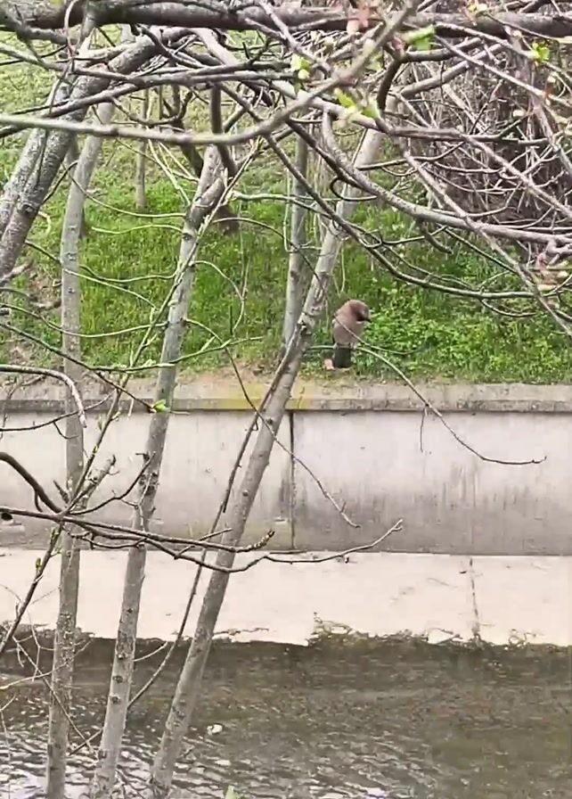 stream of water flowing under a concrete retaining wall, with leafless trees obscuring the view in the foreground. A brown bird is perched on the retaining wall and appears to be preening its feathers. There is trash and greenery in the foreground.