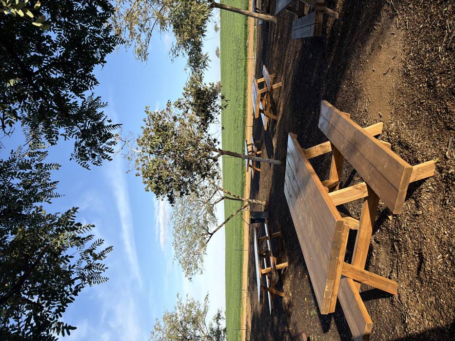 Several wooden picnic tables sit on dark soil under the partial shade of scattered trees
