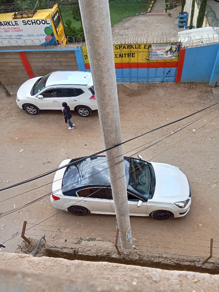 The image provides an elevated view of an unpaved area adjacent to the "SPARKLE SCHOOL" and "SPARKLE E-LEARNING CENTRE" in Nairobi, Kenya, identified by prominent signage on a perimeter wall. Two white vehicles are present on the dirt ground: a Nissan X-Trail SUV is parked near the school wall, and a white sedan with a black roof and black multi-spoke rims is positioned closer to the foreground, its driver's side door slightly ajar. A single individual, dressed in a dark jacket, dark trousers, and white athletic shoes, walks from left to right between the SUV and the school's multi-colored (yellow, blue, red) perimeter wall. A light-colored utility pole stands vertically in the mid-ground, with several dark electrical or communication wires extending horizontally. A low concrete wall topped with rusty metal posts and barbed wire is visible in the immediate foreground, indicating the elevated vantage point of the photographer.