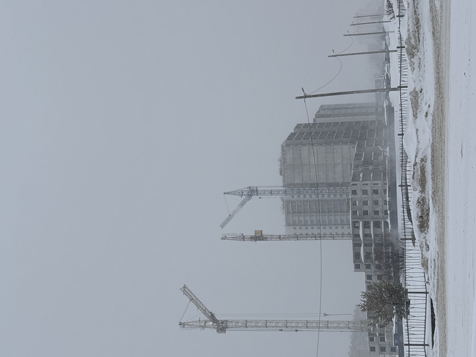 The image displays a construction site within the city of Nizhnekamsk, Russia, under heavy overcast and snowy conditions