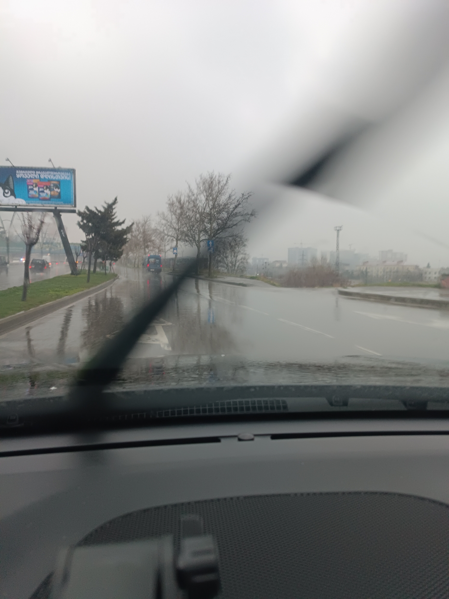 The image depicts an exterior view from inside a moving vehicle on a rainy, overcast day in Tbilisi, Georgia. The immediate foreground shows the vehicle's dark dashboard and the blurred, diagonal streak of a windshield wiper in motion. Beyond the windshield, a wet, multi-lane asphalt road is visible, reflecting the ambient light and distant vehicle headlights. Trees, mostly bare of leaves, line the road, and their reflections are visible on the wet surface. On the left side of the road, a large billboard displays an advertisement for Royal Canin cat food, featuring a cartoon cat's face and multiple product packages. Georgian text on the billboard includes "მიმინოშვილი ყოველდღიური" (MiminosHVili Daily/Everyday), identifying a local supermarket chain, confirming the location as Tbilisi. Several vehicles are present on the road, including a dark-colored car in the left lane and a dark van or minibus further ahead in the right lane. In the far background, a hazy cityscape is discernible through the rain, featuring indistinct buildings and a tall, slender communication or industrial tower, consistent with an urban or semi-industrial area along a major thoroughfare. The scene is static from the perspective of the camera, capturing the dynamic environment of a rainy day from a driver's perspective.