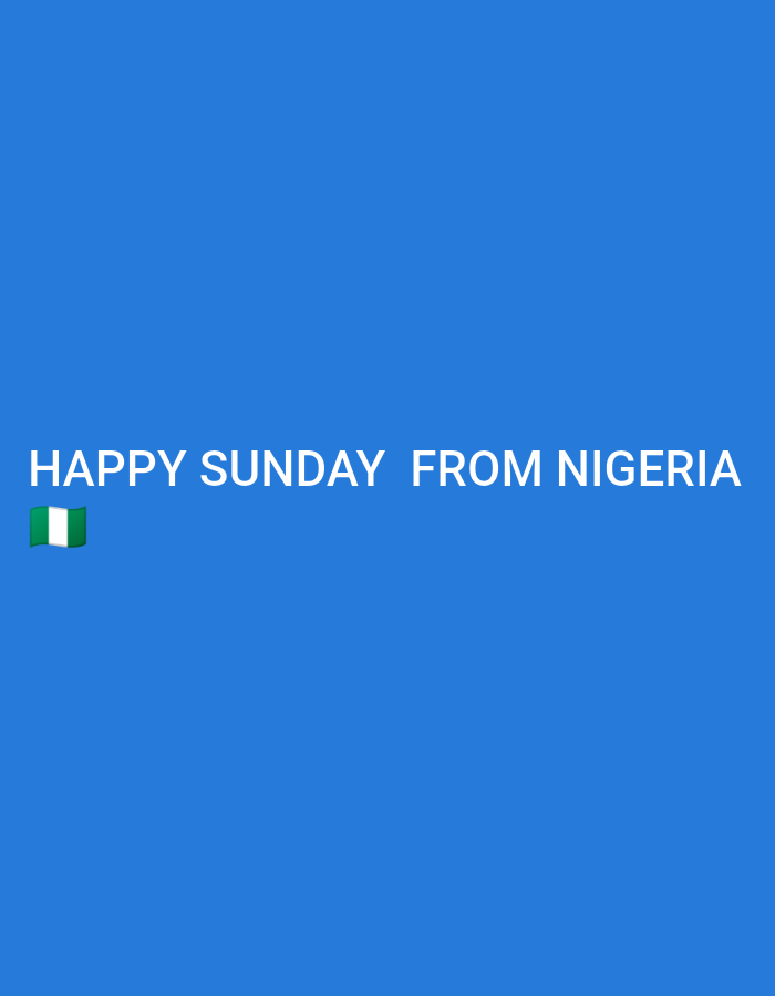 The image is a digital graphic against a solid blue background. White, uppercase sans-serif text reading "HAPPY SUNDAY FROM NIGERIA" is displayed horizontally across the lower central portion of the frame. To the left of the text, a waving Nigerian flag emoji is present, featuring two vertical green bands flanking a central white band. No physical environment, people, subjects, objects (beyond the text and emoji), actions, or interactions are depicted. The image does not visually represent the city of Rido, Nigeria, or any specific geographic location; the reference to Nigeria is contained within the text and flag graphic.