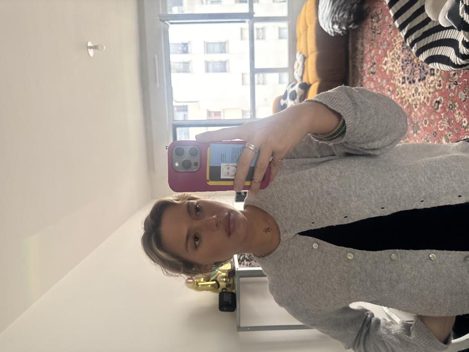 The image depicts a mirror selfie taken indoors within a residential setting in Nogent-sur-Marne, France. A female subject, appearing to be in her twenties or early thirties, is positioned centrally, holding a magenta-cased smartphone with her left hand, which features a clear cardholder containing a French student identification card. She has light-colored, wavy hair with highlights and is wearing a light grey, unbuttoned cardigan over a black top, revealing a small dark pendant on her neck. Multiple rings are visible on her left hand, and a dark green bracelet is on her left wrist. The background, visible in the mirror's reflection, reveals a room furnished with various items. To the subject's left, a golden Buddha statue and a black JBL speaker rest on a light-colored shelf unit. To her right, a large window spans the wall, providing a view of multi-story residential buildings typical of an urban environment. Below the window, a mustard-yellow or orange-brown modular sofa or floor seating is present, adorned with a black and white cow print pillow and a white daisy-shaped cushion. The floor is covered by a patterned rug featuring red, orange, and dark motifs. The ceiling is plain white, with a single exposed light bulb fixture near the top center. The overall lighting suggests natural daylight entering through the window.