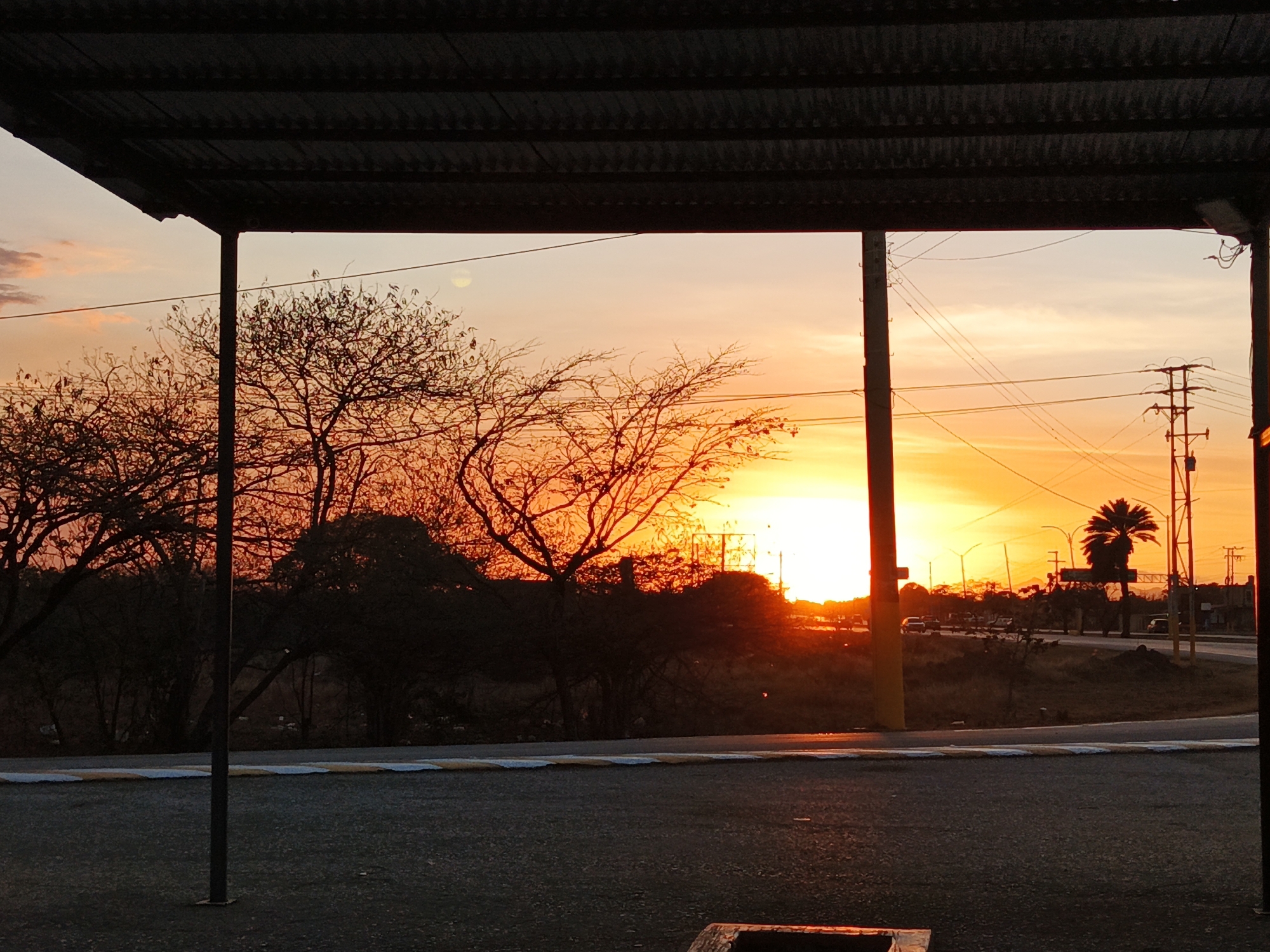 The scene, observed in the city of Las Guevaras, Venezuela, captures a sunset from beneath a dark, corrugated metal roof structure