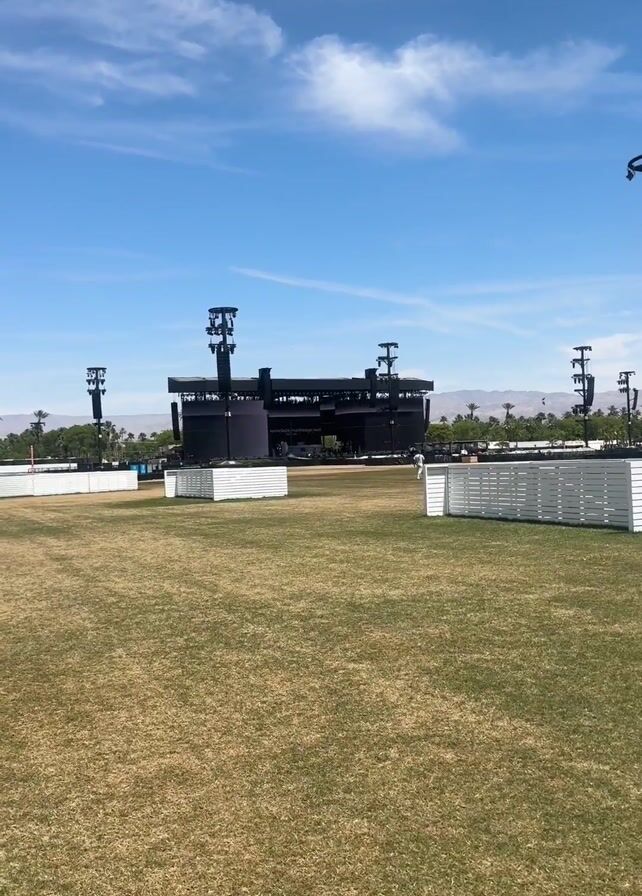 A wide-angle shot presents a Coachella stage surrounded by a sprawling, grassy field