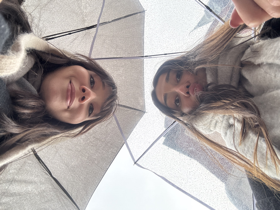 This image, captured in Subotica, Serbia, depicts two adult females viewed from a low-angle, upward perspective during rainfall