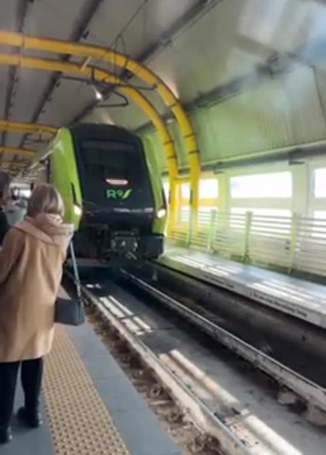green and black train arriving at a covered train station. People stand on the platform, waiting for the train. One person is wearing a tan coat and carrying a black purse. Another person is standing next to them, holding a suitcase. The station has a corrugated metal roof and yellow pipes. The train has the logo "RV" on the front.