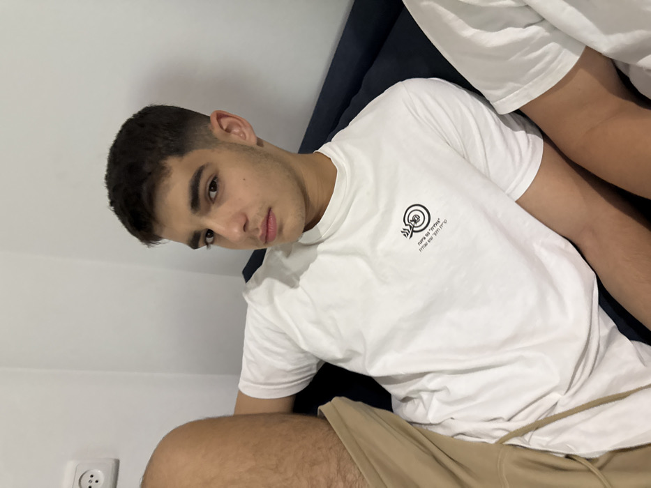 A young male is depicted in an indoor setting, reclining on a dark blue sofa. He has short, dark hair, dark eyebrows, and a neutral expression as he looks directly at the camera. He wears a white short-sleeved t-shirt with a black logo and Hebrew text on the left chest, which reads "בְּכָל לְבָבְךָ" (with all your heart) above a stylized target, and "שׁוּרוּ שָׁמַיִם וְהָבִינוּ" (Look, heavens, and understand) below it. Light brown or khaki shorts are visible on his left thigh. A partial view of a second individual's arm and white t-shirt is present on the right side of the frame. The background consists of a plain white wall, featuring a white two-pin electrical outlet mounted in the upper left corner. The scene is located in Ness Ziona, Israel.