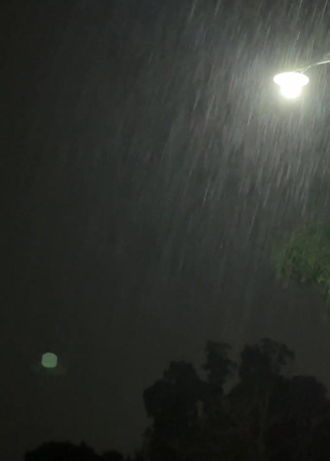 The video depicts a dark, rainy night scene, likely in a residential area. A street lamp illuminates the downpour, casting a bright, focused light against the darkness. Silhouetted trees are visible at the bottom of the frame. Wires, possibly power lines, are strung above, and a blurry green light is visible in the distance. Rain streaks dominate the view, obscuring finer details and creating a sense of heavy precipitation. The camera appears to be positioned under cover, judging by the dark frame on the right side of the scene.