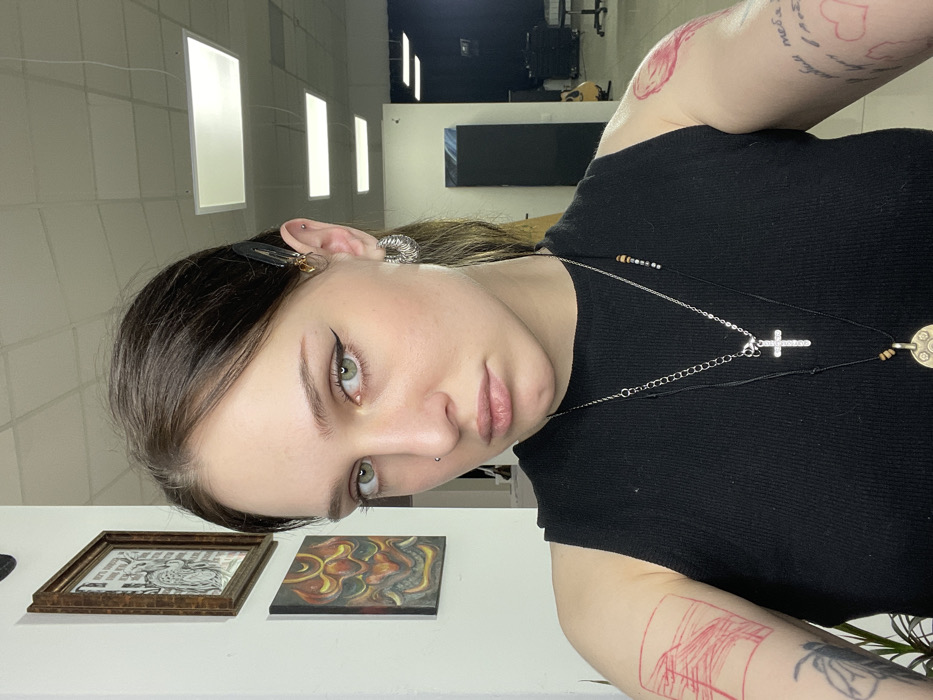 A young adult female, approximately 20-30 years of age, is depicted in a selfie-style, head-and-shoulders portrait taken indoors in Rostov-on-Don, Russia. She has dark brown hair, styled with two black clips visible on the right side of her head. Her green eyes are accentuated with black winged eyeliner, and she has a silver stud piercing on her left nostril and a silver stud and textured hoop earring on her right ear. Her expression is neutral with slightly pursed lips. She wears a black ribbed sleeveless top. Around her neck are two layered necklaces: a shorter silver-colored chain with a studded cross pendant, and a longer black cord featuring wooden beads and a round, metallic, embossed pendant. Her left upper arm displays a red outlined, abstract drawing within a rectangular shape. Her right upper arm features a red outlined jellyfish figure and black script text with a heart symbol. The background consists of white walls. On the left wall, two art pieces are mounted: an upper, vertically oriented framed drawing with intricate details in a dark brown frame, and a lower, horizontally oriented painting of a stylized, colorful mask. The ceiling is white with multiple illuminated rectangular fluorescent light panels. In the far right background, blurred elements suggest a workspace, possibly containing studio equipment and a reflective surface. The lighting is bright and artificial.