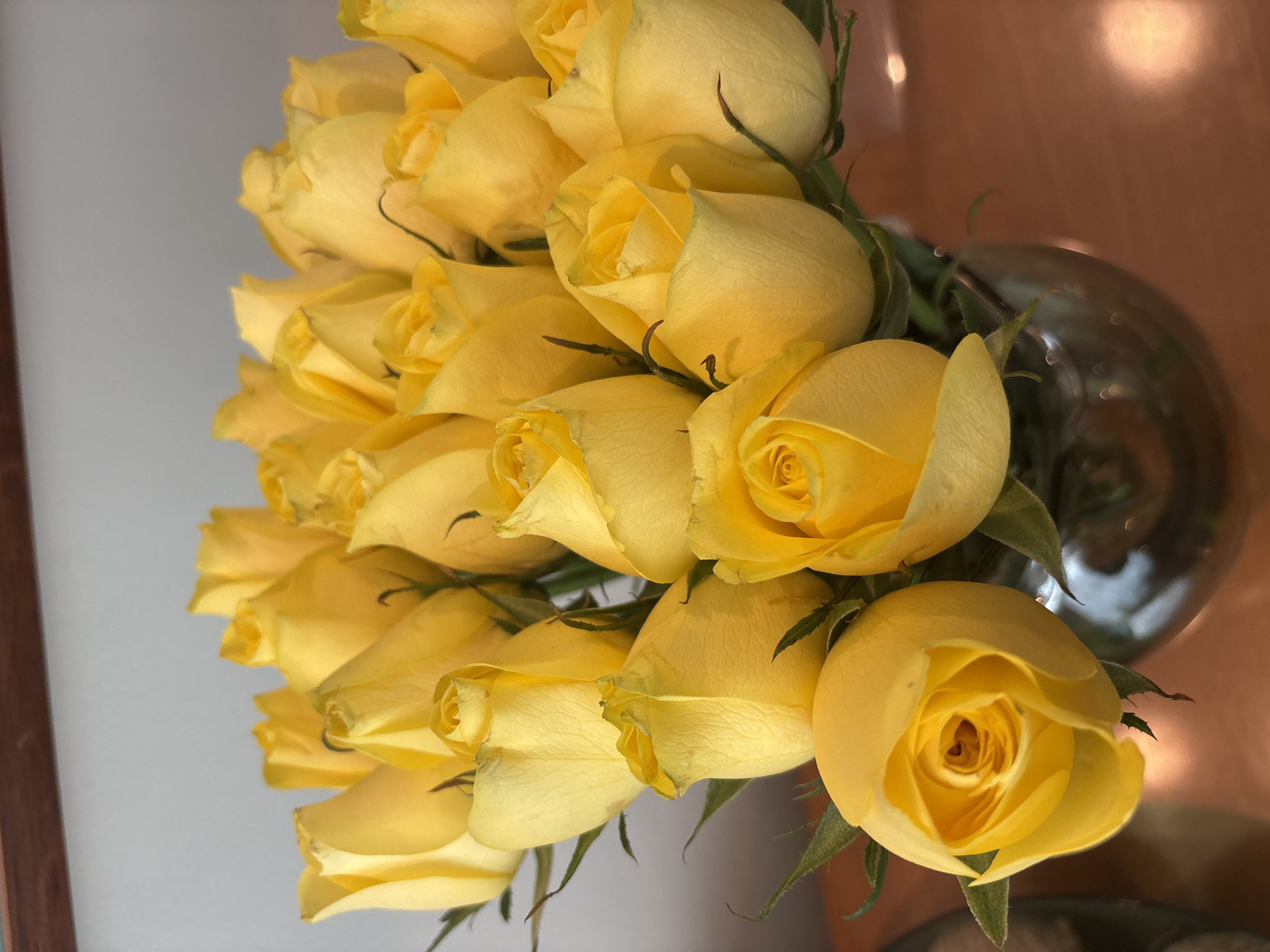 A close-up, slightly angled shot depicts a bouquet of approximately twenty-five yellow roses arranged in a transparent vase