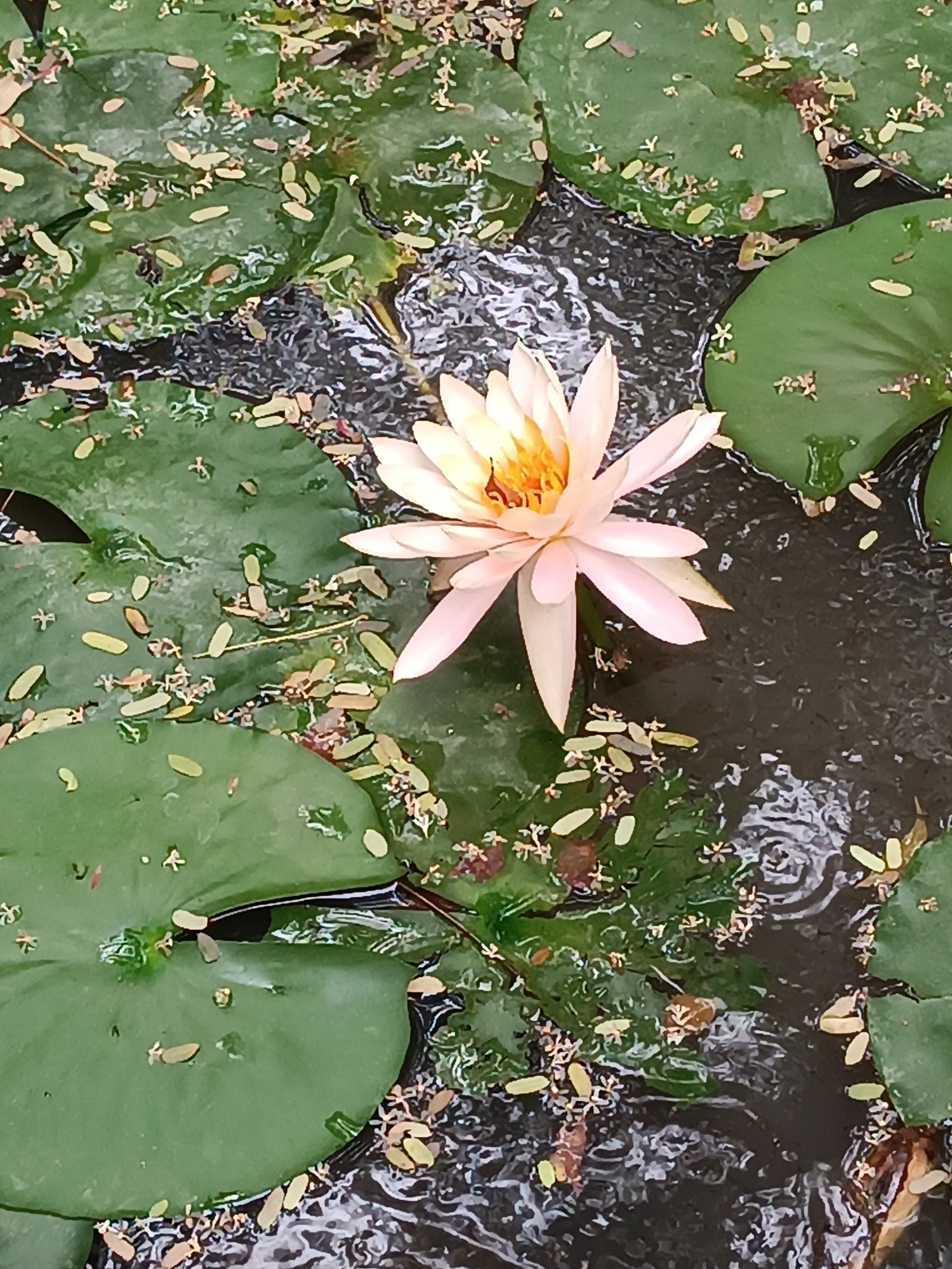 A water lily with pink petals and a yellow center floats in a dark body of water. Lily pads are scattered around the flower. Small leaves and blossoms float on the surface of the water. The image was taken in Puttaparthi, India.