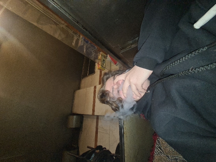 This image depicts an indoor scene within the Sarouja Municipality, Syria. The primary subject is an individual, likely male, with medium-length wavy brown hair, wearing a black hooded sweatshirt. The person is seated and actively exhaling a cloud of white/grey smoke, which emanates from their mouth and nose area. The individual's left hand is raised to their face, partially obscuring the nose and mouth. A white cylindrical object, consistent with a mouthpiece for a smoking device, is visible towards the lower right of the frame, near the subject's right side. The drawstring of the black hooded sweatshirt is prominently visible down the center. The background features a light-colored tiled wall with horizontal brown lines on the left, a dark, textured ceiling, and a metallic or dark-paneled surface on the right. A clear container with yellow contents is visible on a shelf or ledge in the upper right background. A patterned fabric is partially visible beneath the subject's left side. The scene is dimly lit.