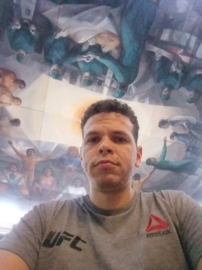 A man wearing a gray Reebok/UFC t-shirt takes a selfie. The background features an artistic mural depicting various scenes, including a surgical operation, a crowd of people with raised hands, and other medical-related imagery. The mural appears to be painted on a ceiling or a large tiled surface.