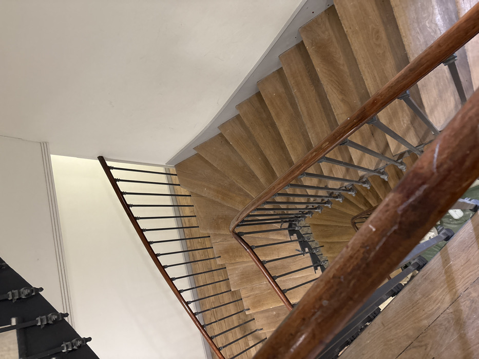The image displays an interior view of a multi-turn wooden staircase descending within a building in Asnières-sur-Seine, France