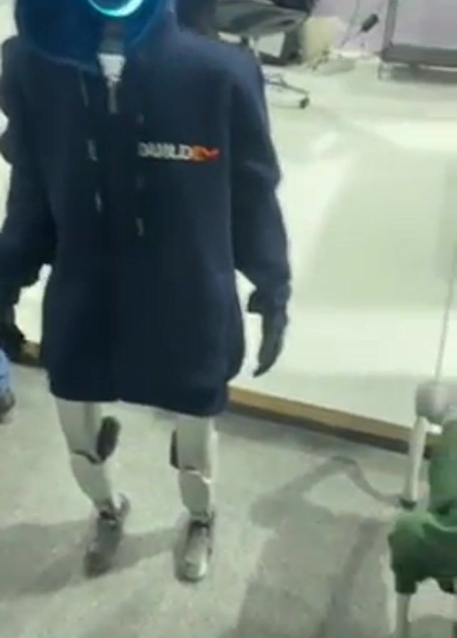 robot convention booth. The video starts with a tall, humanoid robot wearing a dark blue hoodie with the text "BUILDEX" written on it and gloves. The robot has a blue, illuminated screen on its face. It is standing near the corner of the convention booth. The video then pans to a robotic dog wearing a green shirt that reads "Northwestern" and "2". The robotic dog is in the process of falling over. The video pans back to a tall, white, cylindrical robot with a tablet attached to the top. The video ends with the tall, humanoid robot.