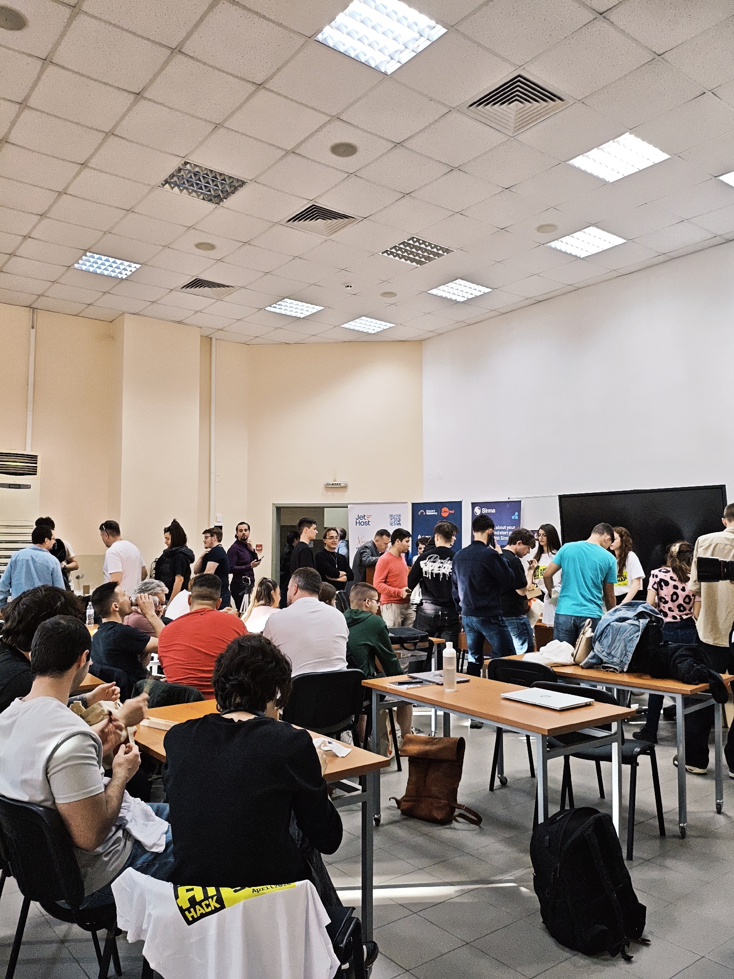 **Location:** The image appears to be taken inside a large hall or room, possibly within a university or event space, located in the city of Ruse, Bulgaria. This is evidenced by banners in the image containing the Bulgarian company Sirma. **Environment:** The hall has a high ceiling with a grid of fluorescent lights and air vents. The walls are a neutral, light color. The floor is tiled. The space is furnished with tables and chairs, with personal belongings such as backpacks scattered around. **People:** The image shows a group of people gathered, engaged in various activities. Some are seated at tables, possibly working or discussing something. Others are standing and interacting with each other, possibly networking or participating in a break period. Some are eating. The attendees are diverse, and appear to be young adults or professionals. **Objects:** Notable objects include: * Tables and chairs arranged for a meeting or conference setting. * Banners and posters. * Laptops on the tables. * Water bottles and other personal belongings. * A black board. **Actions and Interactions:** * People are seated and working or eating. * People are standing and talking. * Some individuals are looking at laptops or phones. * There is a general atmosphere of activity and engagement.