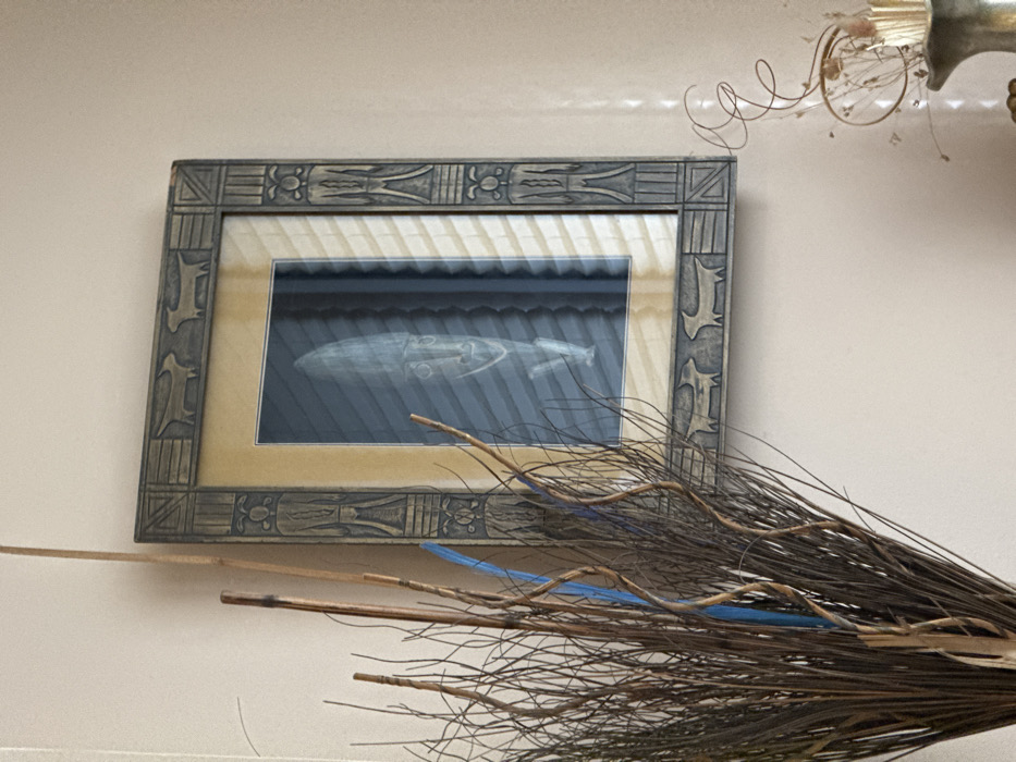 The image displays an indoor scene in Sofia, Bulgaria, featuring a wall-mounted framed artwork partially obscured by a foreground decorative arrangement
