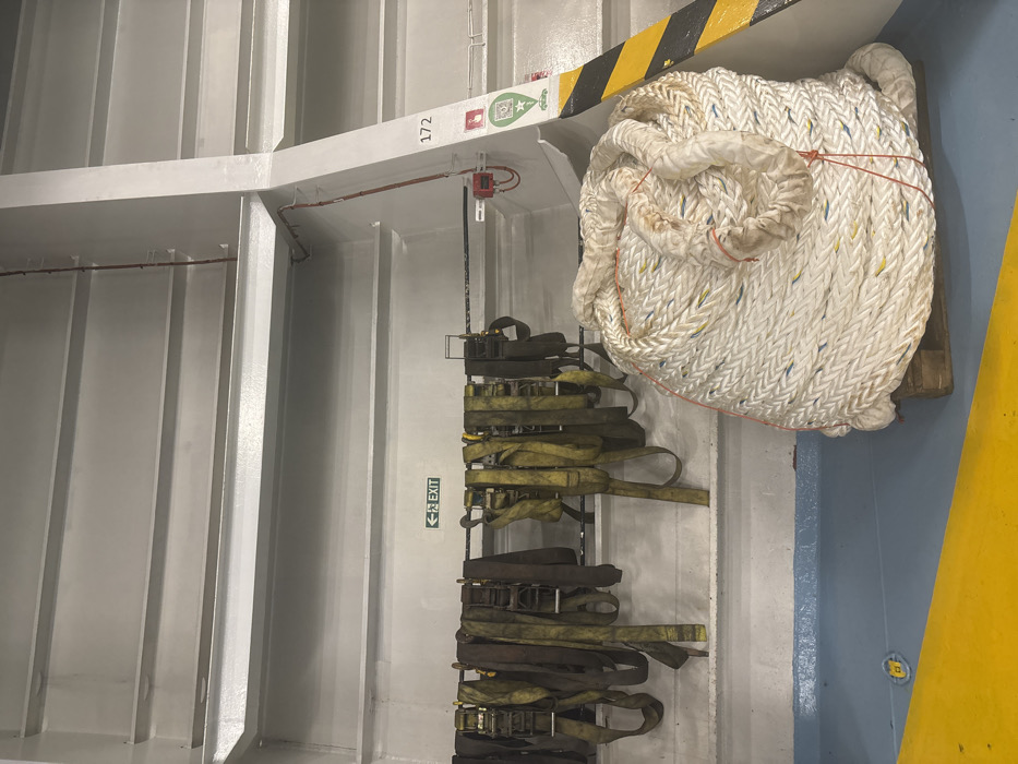 A white rope coil sits secured to a painted blue wall with yellow trim. Below it, on a metal rack attached to a white wall with vertical beams, are multiple stacked, dark yellow cargo straps. An "EXIT" sign is visible. The wall above the rope has a red sensor and a green and red sticker marked "172." A yellow and black hazard stripe is at the top.