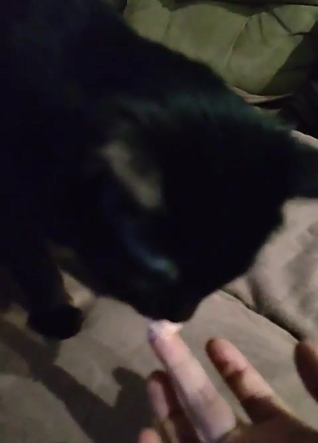 A close-up shows a black cat licking something off a person's finger. The person is holding out their hand, with what appears to be a small amount of a white substance on their index finger. The cat is standing on a light brown, textured surface, likely a sofa or cushion. The background is slightly blurred.