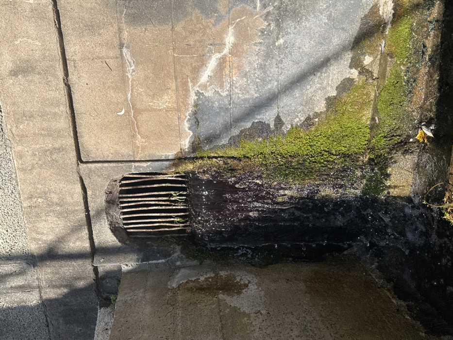 This image depicts a section of a concrete wall in the city of Podostrog, Montenegro, featuring an active drainage outlet