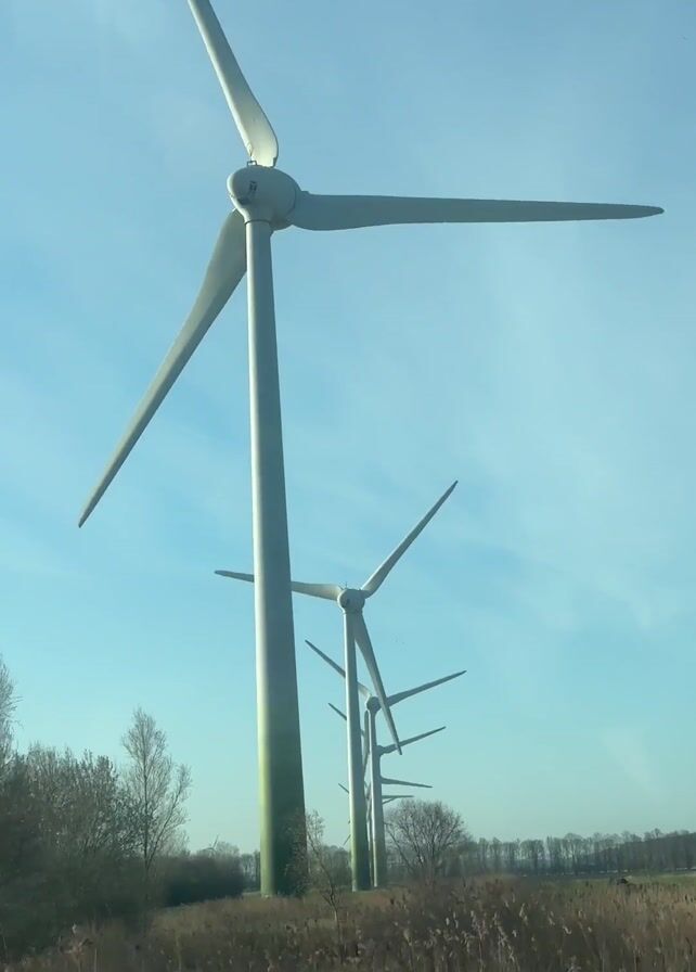 view of wind turbines from a moving vehicle
