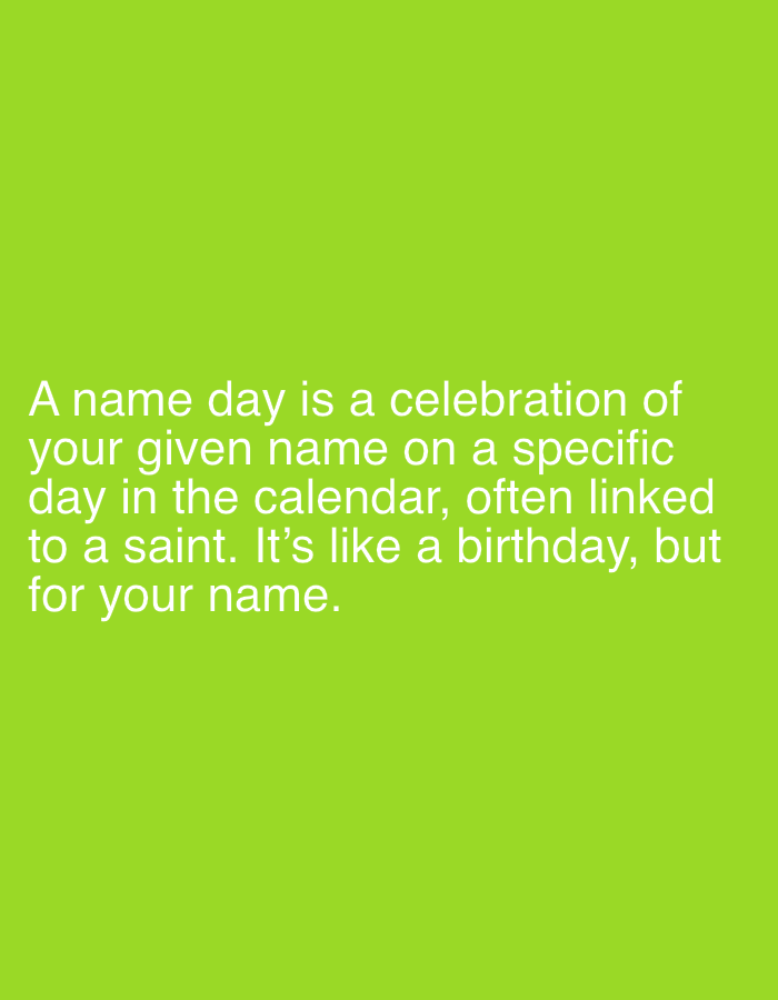 The image displays a solid, vibrant lime green background. White, sans-serif text is centrally positioned in the lower half of the frame. The text reads: "A name day is a celebration of your given name on a specific day in the calendar, often linked to a saint. It's like a birthday, but for your name." No individuals, physical objects other than the text, actions, or interactions are depicted within the scene. The environment is a two-dimensional graphic display of text on a color field. The image contains no visual information identifying a physical location in Sofia, Bulgaria, or any other geographical area.