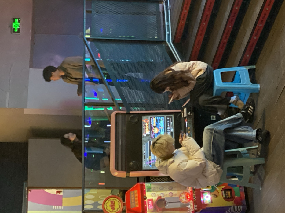 Three people are near arcade games. One person stands behind the arcade machine while two people sit. One seated person wears a cream-colored puffer jacket and blue jeans, looking at their phone. The other wears a tan top with dark bottoms and has long hair. There are stairs with red and black stripes in the background. The arcade games are red, pink, yellow, and purple.