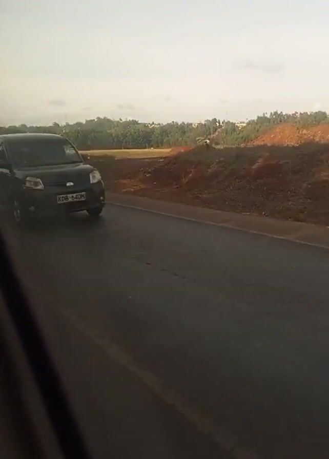 view from a moving vehicle, likely a car or bus, traveling on a paved road. Initially, a white van with a roof rack is visible in the adjacent lane, moving in the same direction. The camera then pans to show the road ahead, and a dark-colored Toyota Land Cruiser passes by in the opposite direction. The environment is rural, with fields and trees visible on either side of the road. There is a person walking on the side of the road near the Land Cruiser. The weather appears to be overcast.