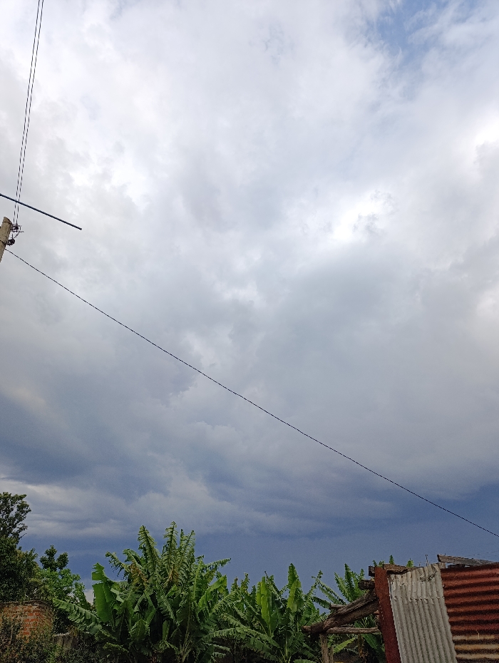 The image displays an outdoor scene under an overcast sky in an unknown city, unknown country. The sky occupies the majority of the frame, featuring extensive grey cloud cover, transitioning from lighter, patchy clouds with hints of blue in the upper right to darker, denser grey clouds closer to the horizon. On the far left, a wooden utility pole with multiple black overhead wires extends vertically into the frame, with one prominent wire stretching horizontally across the mid-section. A dense cluster of large-leafed green vegetation, resembling banana trees, dominates the lower central area. To the immediate right of the vegetation, a structure constructed from corrugated metal sheets, exhibiting both rusted reddish-brown and silver-grey sections, is partially visible, supported by exposed wooden beams. A fragment of a brick wall is visible on the far lower left. No individuals or specific human actions are depicted.