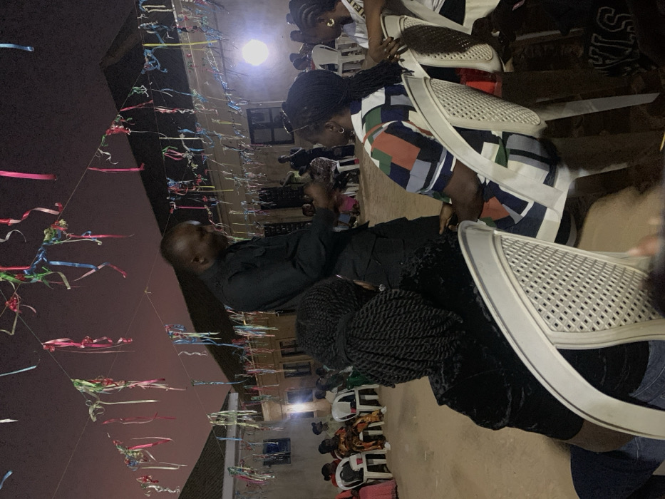 An outdoor gathering shows seated individuals, mostly with dark hair, under hanging colorful ribbons. A man in a black shirt appears to be speaking or presenting, possibly into a microphone. The setting seems to be a courtyard or open space between buildings at dusk or night. Rows of chairs are visible, occupied by people looking in the same direction. Seated attendees are clad in various clothing, suggesting an informal event.