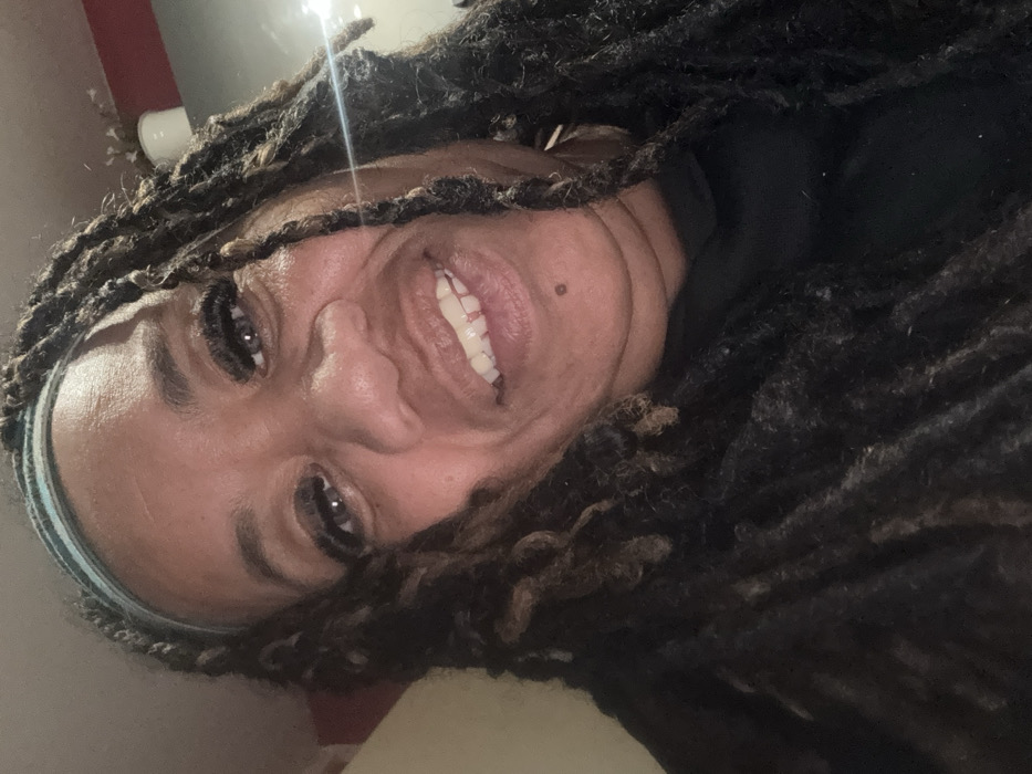 A close-up selfie presents a smiling woman with dark brown dreadlocks framing her face