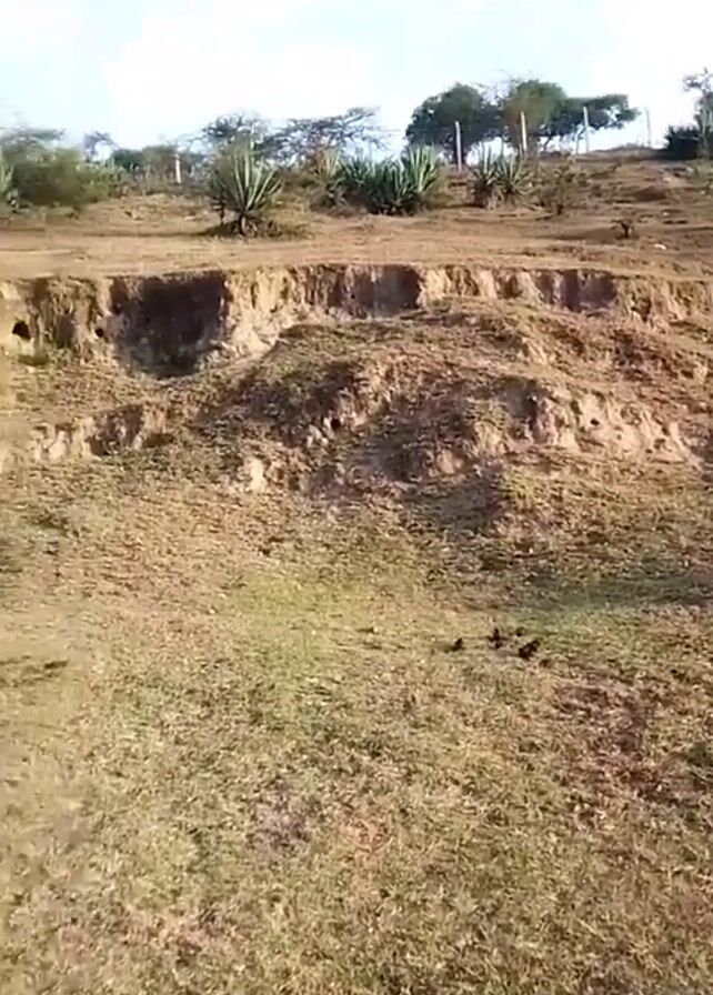 person standing in a grassy field facing a small eroded cliff