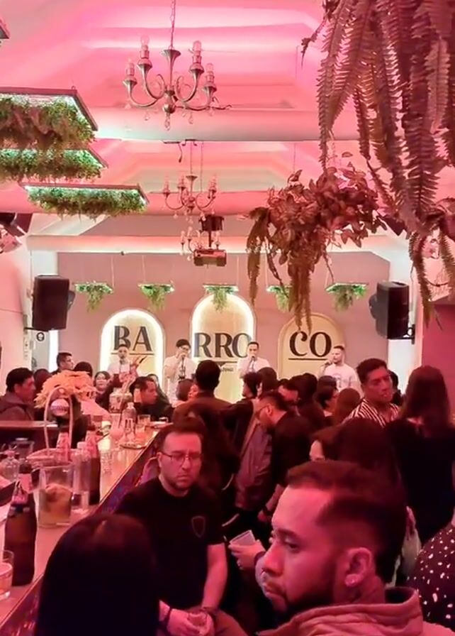 interior of a crowded bar or restaurant, likely at night. The lighting is predominantly pink, with chandeliers and hanging plants adding to the decor. People are standing and mingling, with some seated at the bar. A band is performing on a stage in the background. The overall atmosphere appears lively and social.