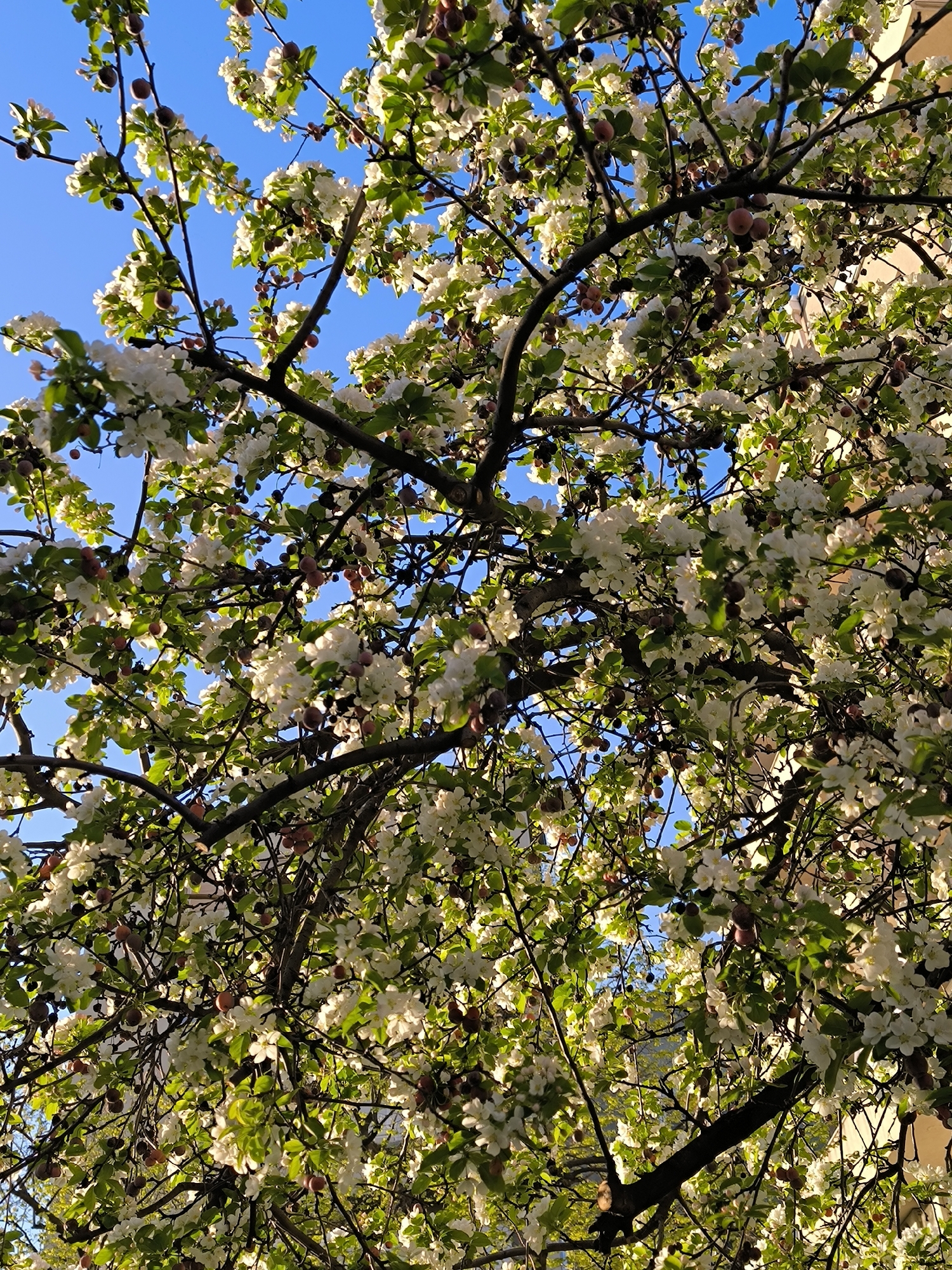 - "tree in full bloom with white flowers and small fruits, likely crabapples, set against a clear blue sky" by FM-ySTmw1, licensed under CC BY 4.0