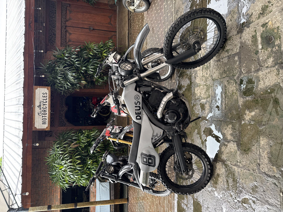 The image displays an exterior scene in front of a custom motorcycle shop in Canggu, Indonesia