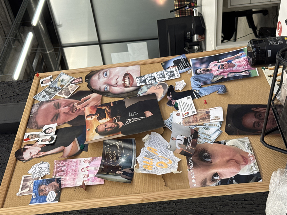 An indoor office environment in Moscow, Russia, is depicted, centered on a vertically oriented cork bulletin board with a light wooden frame. The board is densely populated with numerous printed images, cutouts, and notes, secured by various pushpins. **Subjects and Objects on the Board:** * **Top Left:** A small black and white photograph, a cutout of a cat in a denim jacket with Russian text, a cartoon figure, and a pink flyer for a "VINTAGE PARTY" dated "12.01" featuring four women. * **Top Center:** A large cutout of a woman with dark hair, appearing stressed with her hand to her head, accompanied by three smaller headshot photos of individuals. Adjacent to this, a large cutout of a man with an intense, open-mouthed expression, seemingly biting an unseen object. * **Top Right:** Several cutouts resembling US dollar bills, overlaid with small headshot photographs, and a separate small cutout of a woman's face. * **Mid-Left:** A photograph of a woman in a dark coat beside a speech bubble cutout containing the Russian phrase "СМОТРИ какая булочка" (Look what a bun). Below this, a torn piece of paper inscribed with the Russian text "АЛИ А DJ" (ALI A DJ). * **Mid-Center:** A prominent cutout of two men, one bald man in a black long-sleeve shirt in the foreground, with another bald man (resembling Vin Diesel) in a black tank top behind him. Below this, a cutout showing a person's head looking downwards. * **Mid-Right:** A large cutout of a woman with exaggerated wide eyes, an open mouth, and a lip piercing, displaying a comical expression. Below her, a vertical strip of multiple small headshot photographs and a cutout of a man in a suit. Further down, a cutout of blue jeans. * **Bottom Left:** A close-up cutout of a woman's face, taken from a low angle, highlighting her eyes and prominent eyelashes, with fragmented Russian text reading "Я не могу разорв" (I can't tear) and "и выкинуть в окно" (and throw out the window). * **Bottom Center:** A cutout of a man in a white shirt and tie, a small stack of what appear to be Russian ruble and US dollar bills, and a business card with Russian text. * **Bottom Right:** A cutout of professional football player Lionel Messi in a pink jersey, with a smaller figure perched on his head. Partially visible below this is a black cylindrical container, and another cutout of a person with dark hair resting their head on their hand. **Environment:** The bulletin board is positioned on an unseen surface, likely a desk or counter, in the foreground. The background reveals a dark, textured wall on the left, contrasting with a lighter section and what appears to be a white office desk on the right. A black computer monitor is visible on the desk, alongside a red and black plaid object and other indeterminate office items. Overhead, linear fluorescent lighting fixtures are visible, consistent with a modern office setting.