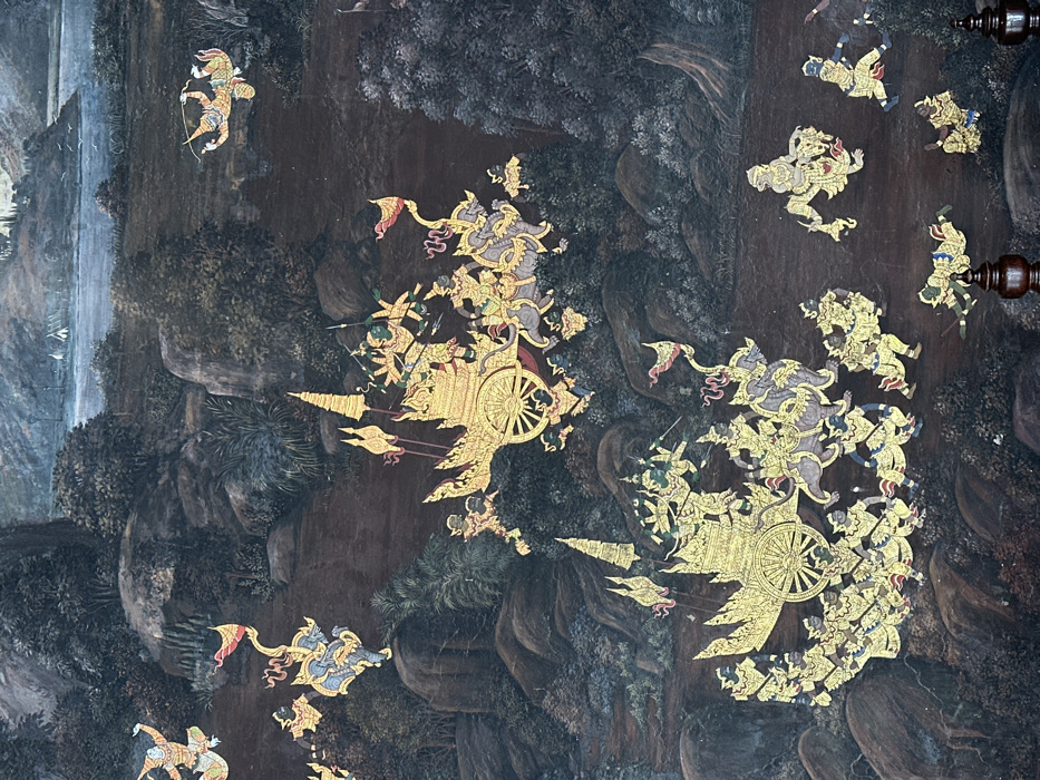 This vibrant painting depicts a battle scene amidst a dark, rocky landscape. Golden figures, possibly deities or warriors, are mounted on chariots and engaged in combat. Some figures wield bows and spears. The overall composition is intricate and dynamic, suggesting a scene of intense action and mythical grandeur. The detailed use of gold accents enhances the visual impact against the darker backdrop.