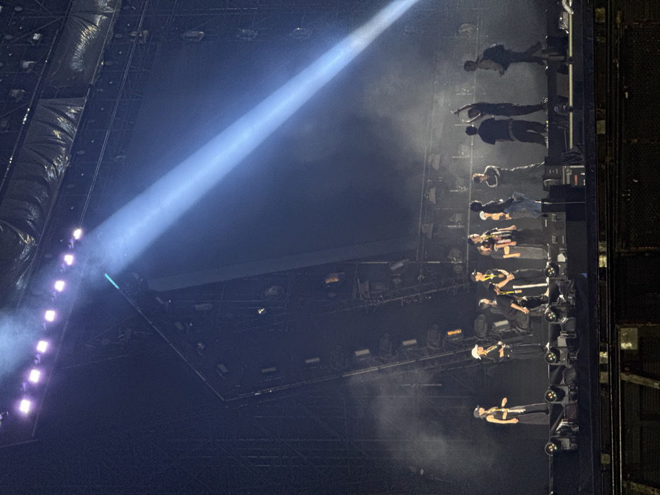 The image displays an outdoor concert stage at night in Nha Trang, Vietnam. The scene is dominated by a large, dark stage structure built with metal scaffolding, supporting numerous purple-emitting LED lights along the top and large vertical display panels. A prominent, focused beam of blue-white light diagonally spans the upper right section, passing through noticeable atmospheric haze. Approximately 15 individuals are present on the stage. They are dressed in casual, predominantly dark clothing, including shirts, trousers, and some wearing caps or hats. Their postures vary from standing still to engaging in subtle movement or interaction. On the far left, an individual wears a long black garment and a light-colored top, standing facing forward. Near the center, a person in a white cap stands upright. Another individual in the central foreground is seen bent forward at the waist. Towards the right, two individuals interact, with one raising a right arm. An individual on the far right is captured in mid-stride, moving towards the stage edge. The stage floor is equipped with several upward-pointing lighting fixtures and dark, rectangular objects consistent with stage monitors or speakers. The primary illumination originates from the stage lighting and the strong diagonal beam, creating high contrast within the dark environment.