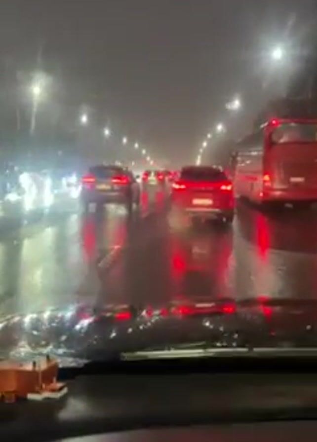 The video is shot from inside a car driving on a wet highway at night