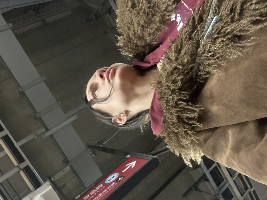 From a low angle, a person looks upward. They are wearing a maroon hooded sweatshirt under a brown jacket with a fringed collar. The background includes part of a building interior with visible pipes and a sign with Japanese text and a directional arrow. The sign also features an icon of an airplane. The light in the scene appears somewhat dim or fluorescent.