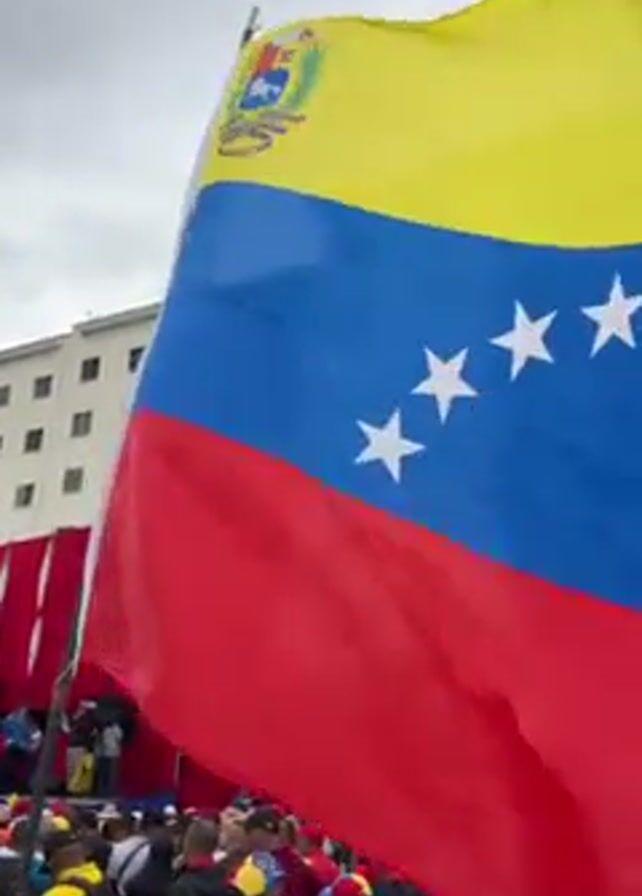 A low-angle shot shows a large Venezuelan flag waving in front of a crowd of people and a white apartment building