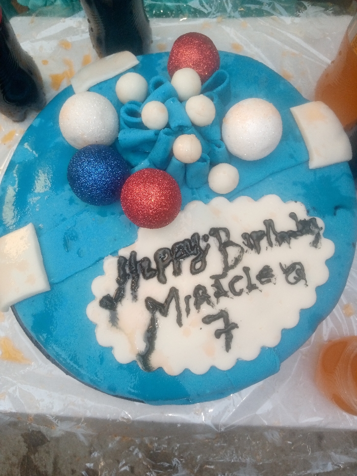 A circular birthday cake is presented on a surface covered with transparent plastic sheeting in Pantame, Nigeria. The cake features a light blue fondant base. Decorations include several spherical ornaments: two large glittery white spheres, one medium glittery blue sphere, one medium glittery red sphere, and multiple smaller, plain white spheres. Blue fondant ribbons or ruffled elements are centrally arranged. Additionally, small, off-white rectangular and trapezoidal fondant pieces are placed at the cake's edges. A white, scalloped-edge plaque on the cake bears the inscription "Happy Birthday Miracle Q 7" in black icing. In the background, partially visible dark-colored plastic bottles, consistent with soft drink containers, and a clear container holding an orange-colored liquid are present. No people are visible.