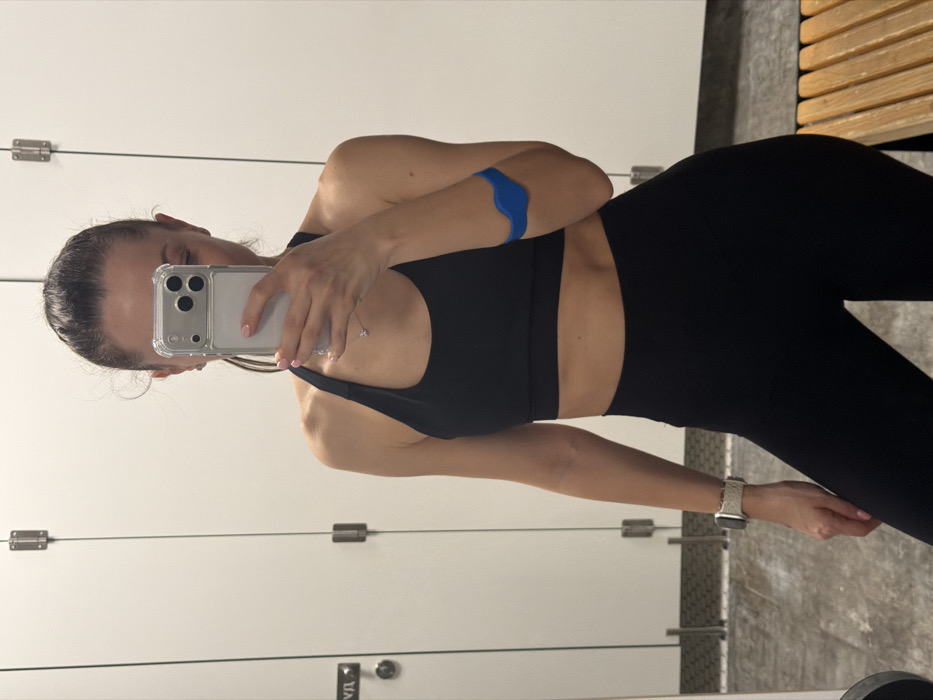 A female subject is depicted standing in what appears to be a changing room, capturing her reflection in a mirror using a smartphone. Her face is largely obscured by the device. She wears a black halter-neck sports bra and matching high-waisted black leggings. On her left wrist, she wears a light-colored Apple Watch with a textured strap. A blue, wavy-shaped armband or device is present on her right bicep. A delicate silver-colored necklace with a single pendant is visible. Her fingernails are painted light pink. The smartphone, held in a clear case, features a multi-lens camera array on its rear. The environment is characterized by white paneled walls or locker doors with visible metal hinges and door handles. Partial Cyrillic text, specifically "УД", is discernible on one of the door panels. The floor, visible in the mirror's reflection, appears dark and reflective, possibly tiled or polished concrete. A wooden slatted bench is also reflected on the right side of the image. The lighting is bright and artificial, suggesting an indoor setting. The specific location within Varna, Bulgaria, cannot be determined from the visual information provided.