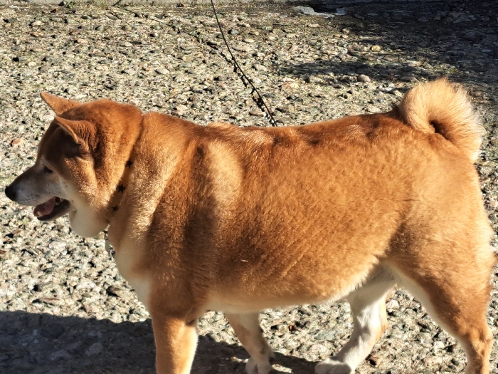 - "A reddish-brown Shiba Inu dog, exhibiting white fur on its chest, belly, and lower legs, stands facing left in profile on a light-colored gravel surface" by FM-KFksB2, licensed under CC BY 4.0
