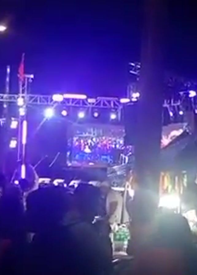 crowd of people at an outdoor concert. A stage is set up with lights, a screen, and sound equipment. There is a band performing on stage, and the screen shows a close-up of the band members. The audience is watching the performance and appears to be enjoying themselves. The atmosphere is lively and festive. There is also a flag visible on a pole behind the stage.