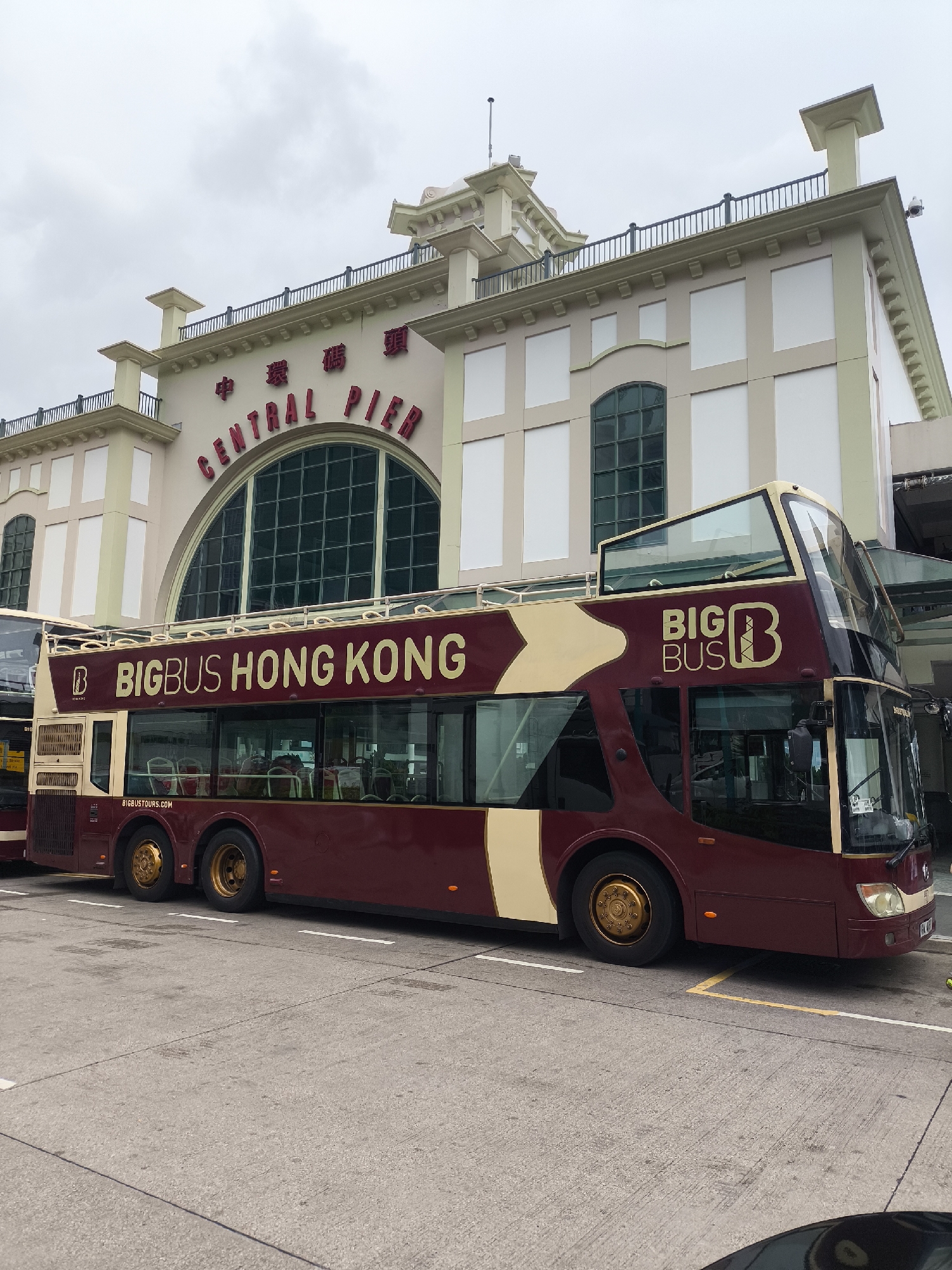 The image depicts a maroon and beige "BIG BUS HONG KONG" double-decker tour bus parked on a concrete surface. The bus is an open-top model with "BIG BUS HONG KONG" text in gold on its side, and golden wheel hubs. In the background, a light beige building with dark green window frames and black railings on its upper level is visible. Red lettering on the building facade reads "CENTRAL PIER" and the Chinese characters "中環碼頭", identifying the location as Central Pier in Hong Kong, China. The sky is overcast. White and yellow road markings are present on the concrete surface in the foreground. A partial view of another vehicle, possibly another bus, is visible to the far left. No clear individuals or specific actions are discernible.