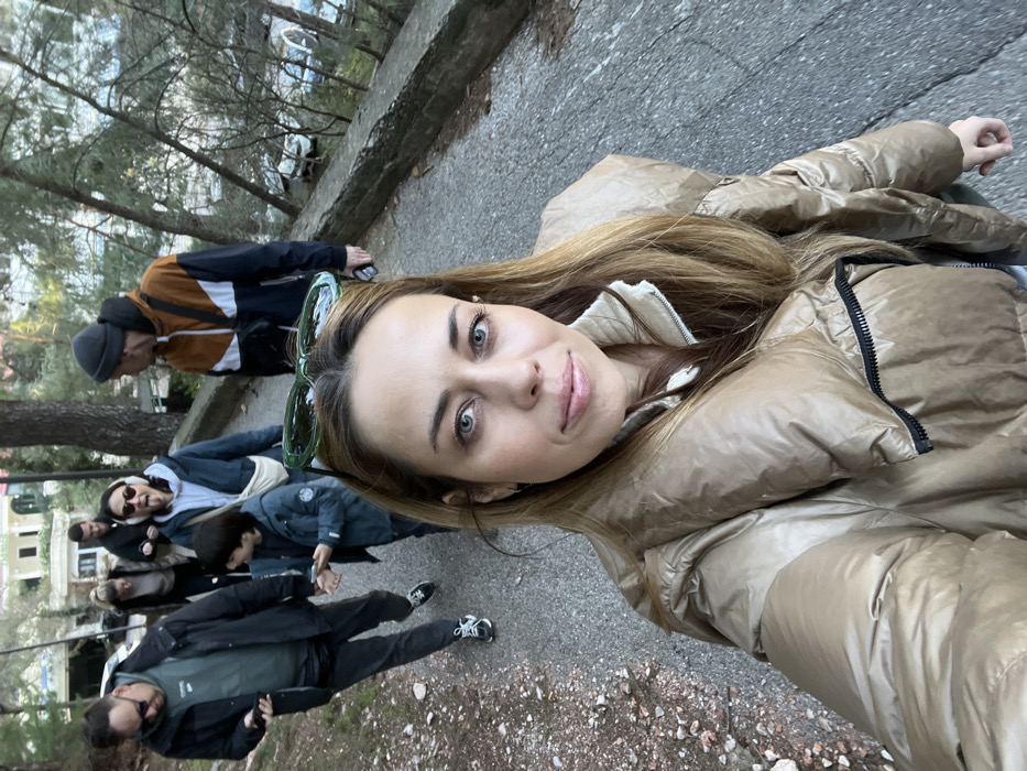 The image depicts an outdoor scene in Petrovac na Moru, Montenegro, featuring a woman taking a selfie with a group of six other individuals walking uphill behind her. In the immediate foreground, a female subject with light brown hair and blue eyes is captured in a selfie perspective. She is wearing a light brown or tan shiny puffer jacket with a large, distinctive collar and what appears to be a light-colored zippered top underneath. A pair of green sunglasses is perched on top of her head. She faces the camera with a neutral to slightly smiling expression. Behind her, on a paved asphalt path, six individuals are walking uphill from left to right. 1. To the far left, a male subject wearing dark sunglasses, a dark jacket, and dark pants holds a mobile phone in his right hand while looking downwards. 2. Behind him, a female subject in a light top and dark pants is partially visible, also walking. 3. Further back and centrally, another male subject in a dark top and pants is seen walking. 4. To the right of the central male, a female subject wearing white headphones and a dark hooded jacket is visible, sticking her tongue out towards the camera. She carries a light-colored cross-body bag. 5. Immediately in front of her, a child in a dark hooded jacket and dark pants is holding and looking at a mobile phone with both hands. 6. To the far right, a male subject wearing a grey beanie, a multi-colored (brown, white, and dark blue) color-block jacket, and a black fanny pack across his chest is looking to his right and slightly downwards, away from the camera. The path is bordered on the left by rough, unpaved ground with some scattered debris and sparse vegetation. On the right, a low, grey concrete or stone retaining wall runs parallel to the path. Beyond this wall, a steep, tree-covered slope descends, with several parked vehicles partially visible through the trees in the distance. In the upper left background, a light-colored multi-story building is partially obscured by trees. The scene is illuminated by natural daylight.