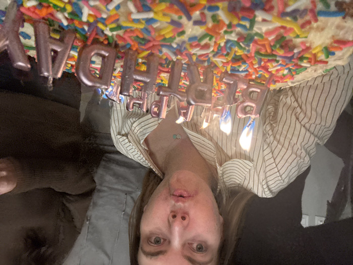 A woman blows out candles spelling "BIRTHDAY" on a sprinkle-covered cake. She wears a striped shirt. The cake appears to be held above her. Her face is visible, and she is making a blowing expression. There is a brown object to her left and a black object to her right, possibly people or furniture. The scene is slightly tilted.