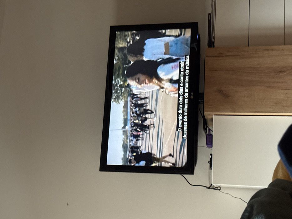 A television mounted on a wall displays a scene with a crowd of people, possibly at a festival or event. Subtitles in Portuguese state, "The event lasts two days and expects to attract tens of thousands of music lovers," with the LG logo visible. Part of a wooden cabinet and a white surface are visible to the side of the television. A person's shoulder and back of the head are in the foreground, possibly watching the TV.
